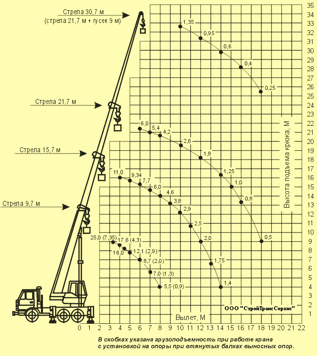 Грузовые характеристики автокрана 25 тонн, основная стрела 30,7м.